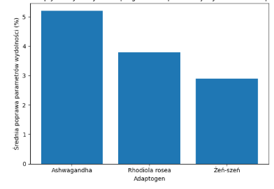 Wykres przedstawia porównanie wyników badań analizujących wpływ wybranych adaptogenów na parametry wydolności fizycznej sportowców. W literaturze najczęściej wskazuje się na szczególnie korzystny wpływ ashwagandhy na parametry VO₂max oraz tolerancję wysiłku, natomiast rhodiola i żeń‑szeń częściej analizowane są w kontekście zmniejszenia odczuwanego zmęczenia oraz poprawy funkcji poznawczych podczas wysiłku.